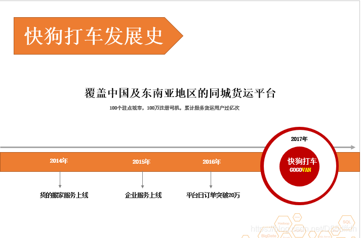 上图是快狗打车的发展史, 2014年快狗打车服务上线,2015年10月份快狗打车的企业服务板块上线,2016年平台日订单突破20万,2017年与海外同城物流平台GOGOVAN达成合作,建立覆盖中国及东南亚地区的同城货运平台,现阶段已有超300驻点城市,百万注册司机,服务货运用户超亿次。
