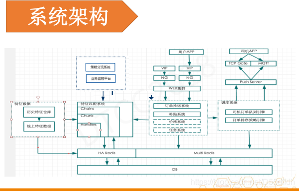上图是我们的订单调度系统架构图、用户下完单后,进入订单推送系统,系统会根据大数据分析订单和用户信息,来判断是否需要对该订单用户给予优惠、对接收该订单司机进行补助,判断完毕进入订单调度系统,通过距离、接单时间等来匹配最优司机完成。系统中的司机订单队列引擎,根据司机的服务质量来进行业务分配,优先服务质量好的司机,以此来正向引导司机为用户提供高质量服务。